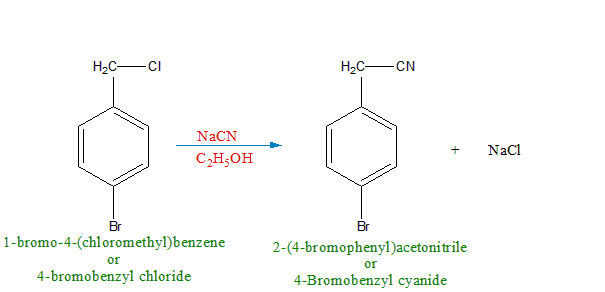 The correct answer is option 1. 4-Bromobenzyl cyanide. The main reactant that has been given to us is of 4 – bromobenzyl chloride. But before we make the molecular structure of this compound, let us understand how to step by step decode the IUPAC name to form the molecular structure. The parent chain in this form of 4 – bromobenzyl chloride is evidently benzyl chloride. The molecular structure for the benzyl group is basically a benzene with a methyl group at position 1 of the ring. Hence, benzyl chloride is formed when a chlorine atom gets attached on the methyl group of the benzyl molecule. Now, 4 – bromobenzyl chloride is formed when a bromine atom is bonded with a carbon atom at position 4 in the benzene ring. Hence, the molecular structure of 4 – bromobenzyl chloride can be given as: