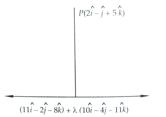 $\vec{r} = 11\hat{i} - 2\hat{j} - 8 \hat{k} + λ (10\hat{i} - 4\hat{j} - 11\hat{k})$. Let the position vector of L be $11\hat{i} - 2\hat{j} - 8 \hat{k} + λ (10\hat{i} - 4\hat{j} - 11\hat{k})$ $=(11+10λ)\hat{i} + (-2-4λ)\hat{j} +(- 8 -11λ)\hat{k} $ Then, $⇒ \vec{PL}= ( 9 + 10 λ) \hat{i} + (-1-4λ) \hat{j} + (-13 -11λ) \hat{k}$ Since PL is perpendicular to the given line which is parallel to vector $\vec{b} = 10 \hat{i} - 4\hat{j} - 11\hat{k}.$ $∴\vec{PL}.\vec{b}= 0 $ $⇒ 10(9 + 10 λ) -4(-1-4 λ) -11(-13-11 λ)= 0 ⇒ λ= - 1$ Putting the value of λ, we obtain the position vector of L as $\hat{i} + 2\hat{j} + 3\hat{k}.$ |
