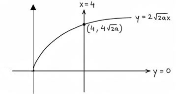 $y = 2\sqrt{2ax}$ x - 4 = 0 y = 0 for $x-4=0$ line $x=4$ at $x=4$ $y=2 \sqrt{2 a \times 4}=y=2 \sqrt{8 a}=4 \sqrt{2 a}$ finding area limit $\rightarrow x=0$ to $x=4$ Area = $\int\limits_0^4 2 \sqrt{2 a x} d x \Rightarrow 2 \sqrt{2 a} \int\limits_0^4 \sqrt{x} d x$ Area = $2 \sqrt{2 a}\left[\frac{x^{1 / 2+1}}{1 / 2+1}\right]_0^4$ $=\frac{2 \times 2 \sqrt{2 a}}{3}(4)^{3 / 2}$ $=\frac{8 \times 4 \sqrt{2 a}}{3}$ $=\frac{32 \sqrt{2 a}}{3}$ |