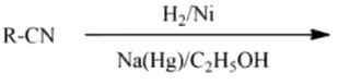 The correct answer is Option (4) → $R-CH_2-NH_2$ Based on the image provided, the reduction of an alkyl nitrile ($R-CN$) using either catalytic hydrogenation ($H_2/Ni$) or chemical reduction with sodium amalgam in ethanol ($Na(Hg)/C_2H_5OH$) yields a primary amine ($R-CH_2NH_2$). Reaction Mechanism The process involves the addition of four hydrogen atoms across the triple bond of the nitrile group: