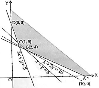 Solve the following linear programming problem graphically: Minimise $Z = 3x+5y$ subject to the constraints: $x + 2y ≥ 10, x + y ≥ 6, 3x + y ≥ 8, x, y ≥ 0$. |