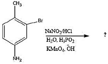 The correct answer is Option (2) → 1. Initial Reactant: 2-bromo-4-methylaniline 2. Step 1: Diazotization and Deamination The ${--NH}_2$ group is replaced by H. Intermediate: 2-bromo-4-methylbenzene 3. Step 2: Oxidation The ${--CH}_3$ group is oxidized to ${--COOH}$. Under harsh basic $(\text{OH}^{-})$ and oxidizing $(\text{KMnO}_4)$ conditions, the Br atom is typically cleaved from the ring. 4. Final Product: 4-methylbenzoic acid (p-toluic acid) |