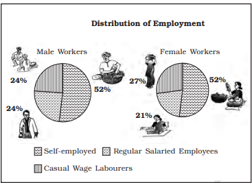 The correct answer is option 1: self-employment Self-employment is a major source of livelihood for both men and women as this category accounts for more than 50 per cent of the workforce. Casual wage work is the second major source for both men and women, a little more so for the latter (24-27 per cent). When it comes to regular salaried employment, both women and men are found to be so engaged in greater proportion. Men form 23 per cent whereas women form 21 per cent. The gap between men and women is very less.