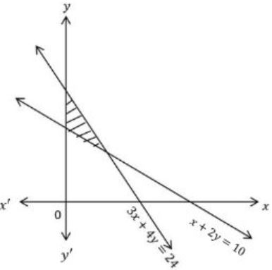 The correct answer is Option (4) → $3x+4y ≤24,x + 2y ≥ 10,x ≥0,y ≥0$ Given: The shaded region is bounded by two lines and lies in the first quadrant. The lines are: 1. $x + 2y = 10$ 2. $3x + 4y = 24$ The feasible region lies below both lines and in the first quadrant (i.e., $x \geq 0,\ y \geq 0$). So, the inequalities are: $x + 2y \geq 10$ $3x + 4y \leq 24$ $x \geq 0$ $y \geq 0$ |