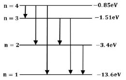 The figure shows the energy level diagram of the hydrogen atom. Out of the six given transitions, which transition results in the emission of a photon of wavelength 4870 Å?: ($h = 6.63 × 10^{-34} Js$) |