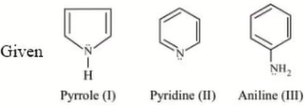 The correct answer is Option (4) → B and D only. A. I is more basic than II The statement "Pyrrole (I) is more basic than Pyridine (II)" is incorrect. In fact, pyrrole is significantly less basic than pyridine. Let us break down the reasons why: Basicity and Availability of the Lone Pair The basicity of a compound depends largely on the availability of its lone pair of electrons to accept protons \((H^+)\). Pyrrole is an aromatic five-membered ring with a nitrogen atom. In pyrrole, the nitrogen's lone pair is involved in maintaining the aromaticity of the ring. The lone pair is delocalized within the \(\pi \)-system of the ring, making it less available to act as a base. This delocalization is necessary to satisfy Hückel’s rule for aromaticity, making pyrrole a weak base. Pyridine, on the other hand, is a six-membered aromatic ring where the nitrogen's lone pair is in an \(sp^2\) hybrid orbital and is not involved in the aromatic \(\pi \)-system. This lone pair is localized and free to accept protons, making pyridine much more basic than pyrrole. Aromaticity and Electron Delocalization In pyrrole, the nitrogen lone pair is essential for maintaining aromaticity because it is part of the conjugated \(\pi \)-electron system. If the nitrogen in pyrrole donates its lone pair (acting as a base), it disrupts the aromatic system, which is highly unfavorable. In pyridine, the nitrogen's lone pair is not part of the aromatic \(\pi \)-system, meaning that pyridine can act as a base without losing its aromaticity. This makes pyridine a much stronger base than pyrrole. Comparison of Basicity Pyrrole has a pKa of its conjugate acid around 0.4, which indicates it is a very weak base. Pyridine has a pKa of its conjugate acid around 5.2, showing it is a significantly stronger base than pyrrole. Summary Pyrrole is less basic than pyridine because its nitrogen lone pair is delocalized in the aromatic π-system and is not available for protonation. Pyridine is more basic because its nitrogen lone pair is localized and available for protonation without disrupting aromaticity. B. II is more basic than I and III The statement "Pyridine (II) is more basic than Pyrrole (I) and Aniline (III)" is correct. Here’s a detailed explanation of the basicity comparison between pyridine (II), pyrrole (I), and aniline (III): Basicity of Pyridine (II) Pyridine is a six-membered aromatic ring with nitrogen as one of the ring atoms. In pyridine, the nitrogen's lone pair is localized in an \(sp^2\) orbital, and it is not involved in the aromatic π-electron system of the ring. This makes the lone pair readily available to accept a proton \((H^+)\), meaning that pyridine can act as a base without losing aromaticity. Pyridine is a moderately strong base with a pKa of its conjugate acid around 5.2, meaning it is more basic than pyrrole and aniline. Basicity of Pyrrole (I) Pyrrole is a five-membered aromatic ring, where the nitrogen's lone pair is delocalized into the \(\pi \)-system, helping to maintain the ring’s aromaticity. Because the lone pair is part of the aromatic system, it is not readily available for protonation, making pyrrole a very weak base. The \(pK_a\) of the conjugate acid of pyrrole is around 0.4, indicating that pyrrole is far less basic than pyridine. Basicity of Aniline (III) Aniline is an aromatic amine where the nitrogen is attached to a phenyl group \((C_6H_5-NH_2)\). In aniline, the nitrogen’s lone pair is in an \(sp^3\) orbital, but it can interact with the aromatic \(\pi \)-system of the benzene ring through resonance. This resonance delocalization decreases the availability of the lone pair to accept a proton, thus reducing the basicity of aniline compared to aliphatic amines. The \(pK_a\) of the conjugate acid of aniline is around 4.6, making it less basic than pyridine but more basic than pyrrole. Basicity Comparison: Pyridine (II): The nitrogen lone pair is not involved in the aromatic π-system, making it highly available for protonation. This makes pyridine the most basic among the three. Aniline (III): The nitrogen’s lone pair is partially delocalized into the benzene ring through resonance, reducing its basicity compared to pyridine, but it is still more basic than pyrrole Pyrrole (I): The nitrogen lone pair is completely delocalized in the \(\pi \)-system of the aromatic ring, making it least available for protonation. As a result, pyrrole is the least basic of the three. Order of Basicity: Pyridine (II) > Aniline (III) > Pyrrole (I) Summary: Pyridine (II) is more basic than both pyrrole (I) and aniline (III) because its nitrogen’s lone pair is available for protonation. Pyrrole (I) is the least basic due to the delocalization of the nitrogen lone pair in the aromatic system. Aniline (III) has intermediate basicity because the lone pair is partially delocalized into the aromatic ring but not as strongly as in pyrrole. Thus, the statement is correct: Pyridine is more basic than pyrrole and aniline. C. III is more basic than II. The statement "Aniline (III) is more basic than Pyridine (II)" is incorrect. In fact, pyridine is more basic than aniline. Let us go into detail about why this is the case: Basicity of Aniline (III) Aniline \((C_6H_5NH_2)\) is an aromatic amine where the nitrogen atom is directly attached to a benzene ring. The lone pair of electrons on the nitrogen atom in aniline can participate in resonance with the \(\pi \)-electrons of the benzene ring. This delocalization reduces the availability of the lone pair to accept a proton, thus making the nitrogen less basic. Resonance in aniline stabilizes the molecule, but it also reduces the electron density on nitrogen, decreasing its ability to act as a base. Aniline’s conjugate acid has a \(pK_a\) around 4.6, which makes it moderately basic, but less basic than pyridine. Basicity of Pyridine (II) Pyridine is a six-membered aromatic ring containing nitrogen. In pyridine, the nitrogen’s lone pair is in an \(sp^2\) or
