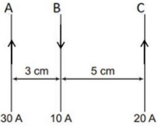 Consider three long straight parallel wires as shown in the figure. Length of wire B is 25 cm. Choose the correct options. (A) Net force experienced by wire B is $2 × 10^{-4} N$ towards left Choose the correct answer from the options given below: |