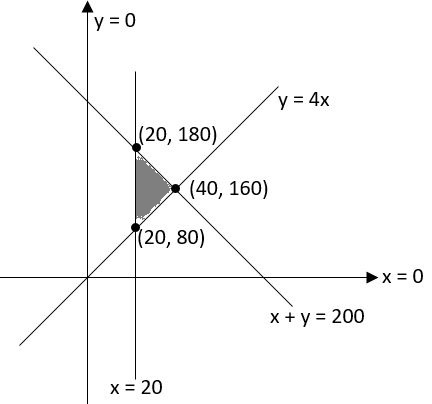 x = 20 for y ≥ 4x checking for random point (20, 100) → 100 ≥ 80 so the side of line at which it lies is solution region for x + y ≤ 200 checking for (0, 0) ⇒ 0 ≤ 200 hence side at which (0, 0) lies is solution region at and taking intersection region to get possible region, we get following corner points (20, 180) (20, 80) (40, 160) A, C and E |