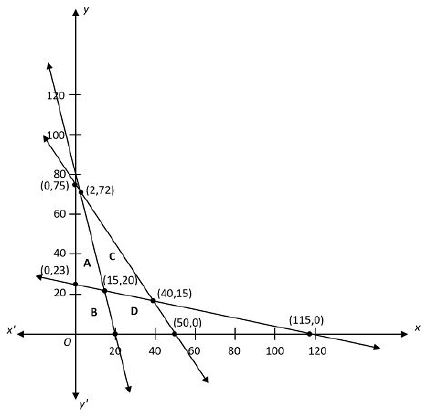 The correct answer is Option (3) → Region C Given constraints $4x+y\ge80$ $x+5y\ge115$ $3x+2y\le150$ $x\ge0,\;y\ge0$ Find intersection points of boundary lines Intersection of $4x+y=80$ and $x+5y=115$ $y=80-4x$ $x+5(80-4x)=115$ $x+400-20x=115$ $-19x=-285$ $x=15$ $y=20$ Point $(15,20)$ Intersection of $4x+y=80$ and $3x+2y=150$ $y=80-4x$ $3x+2(80-4x)=150$ $3x+160-8x=150$ $-5x=-10$ $x=2$ $y=72$ Point $(2,72)$ Intersection of $x+5y=115$ and $3x+2y=150$ $x=115-5y$ $3(115-5y)+2y=150$ $345-15y+2y=150$ $-13y=-195$ $y=15$ $x=40$ Point $(40,15)$ Intersection with axes From $4x+y=80$, at $x=0$, $y=80$ but does not satisfy $x+5y\ge115$ From $x+5y=115$, at $y=0$, $x=115$ but violates $3x+2y\le150$ From $3x+2y=150$, at $x=0$, $y=75$ but violates $x+5y\ge115$ Hence feasible corner points are $(2,72),\;(15,20),\;(40,15)$ The feasible region is the triangular region with vertices $(2,72),\;(15,20),\;(40,15)$. |