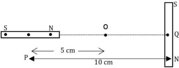 The correct answer is Option (1) → $\sqrt{5} × 10^{-2} T$ Given magnetic moment of each short bar magnet: $M=12.5\ \mathrm{A\,m^2}$. Separation between centers = $10\ \mathrm{cm}$, so distance of O from each center = $r=5\ \mathrm{cm}=0.05\ \mathrm{m}$. Use $\frac{\mu_0}{4\pi}=10^{-7}\ \mathrm{T\,m/A}$. Field on the axial line of a dipole at distance $r$: $B_{\text{axial}}=\frac{\mu_0}{4\pi}\frac{2M}{r^3}$ Field on the equatorial line of a dipole at distance $r$: $B_{\text{eq}}=\frac{\mu_0}{4\pi}\frac{M}{r^3}$ For the left magnet (axial at O): $B_1=B_{\text{axial}}=10^{-7}\frac{2M}{r^3}$ For the right magnet (equatorial at O): $B_2=B_{\text{eq}}=10^{-7}\frac{M}{r^3}$ Numerical values: $B_2=10^{-7}\frac{12.5}{(0.05)^3}=0.01\ \mathrm{T}$ $B_1=2B_2=0.02\ \mathrm{T}$ Since $B_1$ and $B_2$ are perpendicular, resultant magnitude at O is: $B=\sqrt{B_1^2+B_2^2}=\sqrt{(2B_2)^2+B_2^2}=\sqrt{5}\,B_2=0.01\sqrt{5}\ \mathrm{T}$ Final value: $B=0.01\sqrt{5}\ \mathrm{T}\approx 2.236\times10^{-2}\ \mathrm{T}$ |