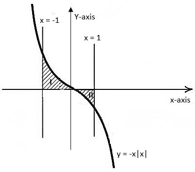 y = -x|x| $y=\left\{\begin{array}{rl}-x^2 & x \geq 0 \\ x^2 & x<0\end{array}\right.$ plotting graph x-axis x = -1 and x = +1 area of region I = area of region II (by symmetry) So total area = 2 × area of region I $=2 x \int\limits_{-1}^0 x^2 d x$ $2 \times\left[\frac{x^3}{3}\right]_{-1}^0$ $= \frac{2}{3}$ sq units |