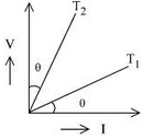 V-I graph for a platinum wire at temperatures $T_1$ and $T_2$ is shown in the given figure. The temperature difference $(T_2-T_1)$ is proportional to: |