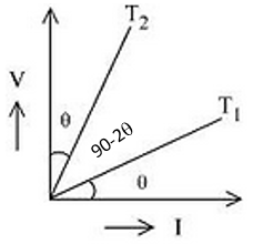 The correct answer is Option (4) → $\cot 2θ$ for a metal like platinum, the resistance is, $R_T=R_0(1+α(T-T_0))$ and, The temperature difference is proportional to the change in the slopes of the V-I graphs. $T_2-T_1∝\tan(90-2θ)$ $∝\cot 2θ$ |