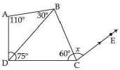 In the given figure, for quadrilateral ABCD, A+B+C+D = 360 Now assuming the missing angle CBD adjoining to 30 be y 110+30+y+75+60 = 360 y = 360-275 = 85 In triangle BCD, CBD+BDC+BCD = 180 (Assume BDC = p) y+p+60 = 180 p = 180-60-85 p = 35 since CE is parallel to DB due to interior angle property, BDC+DCE = 180 p+60+x = 180 DCE = 180-35-60 = 85 The correct answer is Option (4) → 85° |