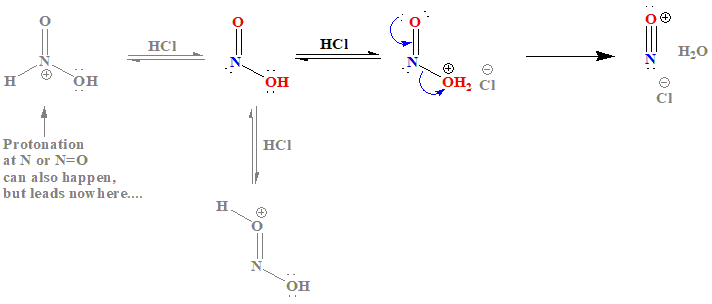 The key purpose of HCl is to further convert HNO2 into the powerful electrophile \(NO^+\), the “nitrosonium ion”, which is the key electrophile in the reaction that forms the diazonium salt. The nitrosonium ion is formed through protonation of OH and resultant loss of water: