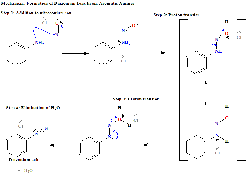 Part 2: Formation of the diazonium ion The next step is formation of the diazonium ion from the reaction between the amine and the nitrosonium ion, which also requires acid. The first step is formation of a new N–N bond, which occurs through attack of the nitrosonium ion by the aromatic amine (Step 1). This is followed by two proton transfers from nitrogen to oxygen (Steps 2 and 3) accompanied by reorganization of the pi bonding framework [forming N–N (pi), breaking N–O (pi) ]. The final step is formation of the nitrogen-nitrogen triple bond accompanied by expulsion of water (Step 4).