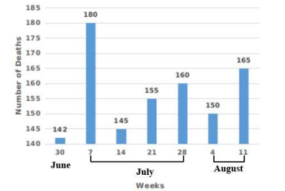 Lets solve one by one for each option . 1. 21 July to 28 July There is increase in number of deaths as we move forward. 2. 14 July to 21 July There is increase in number of deaths as we move forward. 3. 4 August to 11 Ausgust There is increase in number of deaths as we move forward 4. 30 June to 7 July Number of deaths in 30 June week = 180 Number of deaths in 7 July week = 142 Fall in number of deaths = 180 - 145 = 38 So , Highest fall in number of deaths appear in 30 June to 7 July weeks. |