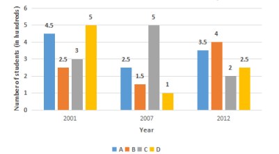 The following bar graph shows the number of students (in hundreds) who have opted for different courses A, B, C and D in 3 years in a college. Study the graph and answer the question. In the year 2007, the average number of students across the four courses is (in hundreds): |