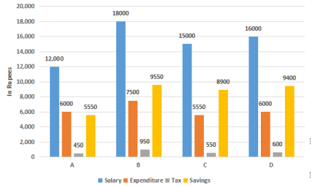 The above graph represents the salary, expenditure, tax and savings (in rupees) per month ofthe persons A, B, C and D. Study the graph and answer the question. Savings as a percentage of salary is highest in case of: |