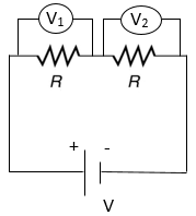 The correct answer is Option (3) → $\frac{V}{2},i$ In a series combination of two identical resistors, the resistors are connected end to end. $R_{eq}=R+R$ $R_{eq}=2R$ Now, $I=\frac{V}{R_{eq}}=\frac{V}{2R}$ [According to Ohm's law] $∴V=IR$ [According to Ohm's law] $V_1=R×\frac{V}{2R}=\frac{V}{2}$ $V_2=R×\frac{V}{2R}=\frac{V}{2}$ |