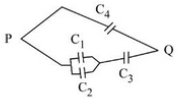 Four identical capacitors each of capacitance C are arranged as shown in the figure. What is the effective capacitance between P and Q? |