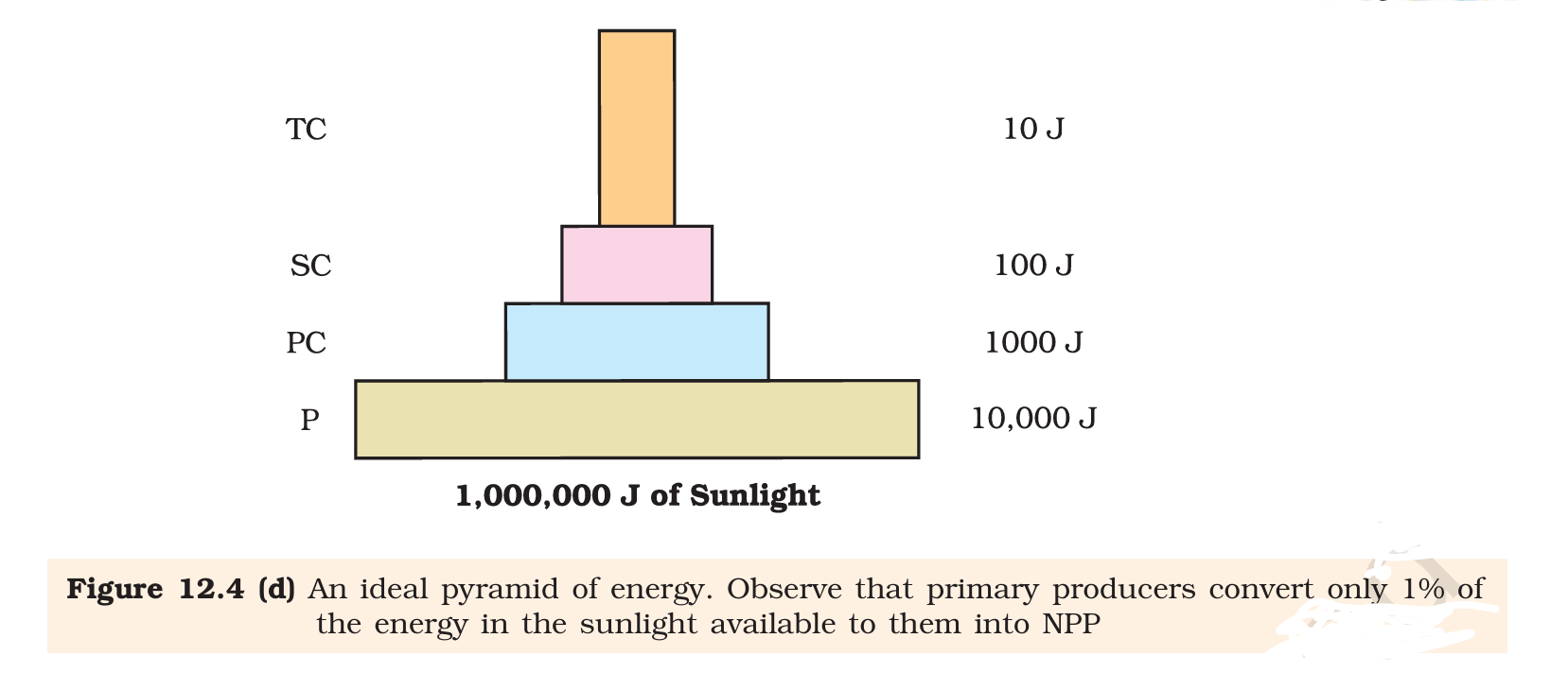 The correct answer is Option (1) → 200 J The correct answer is 200 J. First statement: Only about 1 percent of the total sunlight that falls on producers is converted into chemical energy and stored as net primary productivity. Reasoning: Therefore, the primary producer converts 200 joules of the available sunlight into net primary productivity.