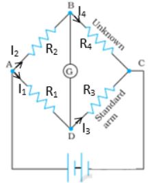In a Wheatstone bridge, the resistances $R_1, R_2, R_3$ and $R_4$ present in four arms are 10 Ω, 30 Ω, 30 Ω and 90 Ω respectively. If the galvanometer resistance is 50 Ω and the voltage of the battery is 7 V and its internal resistance is 5 Ω, then the total current drawn from the battery is |