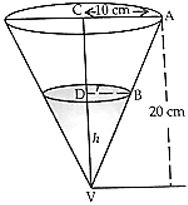 Water is leaking from a conical funnel at the rate of $5\, cm^3/sec$. If the radius of the base of the funnel is 10 cm and its height is 20 cm, find the rate at which the water level is dropping when it is 5 cm from the top. |