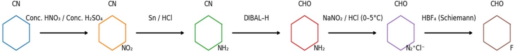 (i) $Sn/HCl$ (ii) $Conc.HNO_3/Conc.H_2SO_4$ (iii) $DIBAL-H$ (iv) $NaNO_2/HCl$ (v) $HBF_4$ (i) $Conc.HNO_3/Conc.H_2SO_4$ (ii) $Sn/HCl$ (iii) $DIBAL-H$ (iv) $NaNO_2/HCl$ (v) $HBF_4$ (i) $NaNO_2/HCl$ (ii) $DIBAL-H$ (iii) $Sn/HCl$ (iv) $Conc.HNO_3/Conc.H_2SO_4$ (v) $HBF_4$ (i) $NaNO_2/HCl$ (ii) $DIBAL-H$ (iii) $Sn/HCl$ (iv) $HBF_4$ (v) $Conc.HNO_3/Conc.H_2SO_4$ |