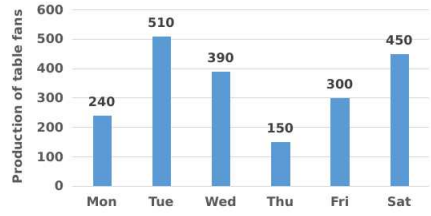 The given bar graph shows the production of table fans in a factory during one week. Study the bar graph and answer the question that follows. The average production of table fans from Monday to Wednesday is approximately what percentage more than the average production of table fans from Thursday to Saturday? (correct to one decimal place) |