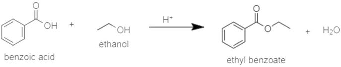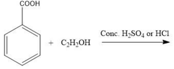 A carboxylic acid reacts with alcohol in presence of acid catalyst to form an ester. This is known as Fischer esterification. Reaction: $\text{Benzoic acid} + \text{Ethanol} \rightarrow \text{Ethyl benzoate} + \text{Water}$ Acid catalyst: conc. $\text{H}_2\text{SO}_4$ or $\text{HCl}$ So product formed is: $\text{C}_6\text{H}_5\text{COOC}_2\text{H}_5$ (Ethyl benzoate) Option 1: $\text{C}_6\text{H}_5\text{COC}_2\text{H}_5$ This is a ketone. Not formed from acid + alcohol reaction. Option 2: $\text{C}_6\text{H}_5\text{CH}_2\text{OH}$ This is benzyl alcohol. Reduction product, not esterification product. Option 3: $C_6H_5COCH_3$ This is acetophenone. Formed via Friedel-Crafts acylation, not esterification. Option 4: $C_6H_5COOC_2H_5$ This is ethyl benzoate. Formed via esterification. Correct. |