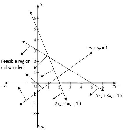 The LPP: Max. \(z=x_{1}+\frac{5}{2}x_{2}\) subject to \(5x_{1}+3x_{2}\leq 15, -x_{1}+x_{2}\leq 1, 2x_{1}+5x_{2}\leq 10\) and \(x_{1},x_{2}\geq 0\) has |