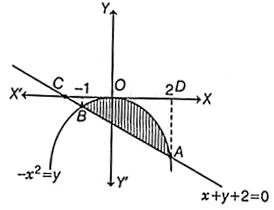 The correct answer is Option (1) → $\frac{9}{2} \text{ sq. units}$ We have, $y = -x^2$ and $x + y + 2 = 0$ $\Rightarrow -x - 2 = -x^2$ $\Rightarrow x^2 - x - 2 = 0$ $\Rightarrow x^2 + x - 2x - 2 = 0$ $\Rightarrow x(x + 1) - 2(x + 1) = 0$ $\Rightarrow (x - 2)(x + 1) = 0 \Rightarrow x = 2, -1$ On solving both equations, we get Let $A_1 = \text{Area above the line } x + y + 2 = 0$ i.e., $A_1 = \text{Area of CODABC}$ and $A_2 = \text{Area above the curve } y = -x^2$ i.e., $A_2 = \text{Area ODAOBCO}$ $∴$ Area of shaded region $A = A_1 - A_2$ $= \int\limits_{-1}^{2} (-x - 2) \, dx - \int_{-1}^{2} -x^2 \, dx$ $= \left|\int_{-1}^{2} (-x - 2 + x^2) \, dx\right| = \left| \int_{-1}^{2} (x^2 - x - 2) \, dx \right|$ $= \left| \left[ \frac{x^3}{3} - \frac{x^2}{2} - 2x \right]_{-1}^{2} \right| = \left| \left[ \frac{8}{3} - \frac{4}{2} - 4 + \frac{1}{3} + \frac{1}{2} - 2 \right] \right|$ $= \left| \frac{16 - 12 - 24 + 2 + 3 - 12}{6} \right| = \left| -\frac{27}{6} \right| = \frac{9}{2} \text{ sq. units}$ |