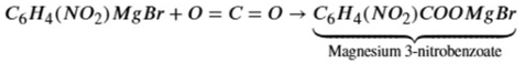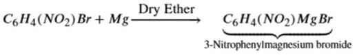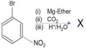 The correct answer is Option (3) → 3-Nitrobenzoic acid Core Concept: This reaction follows Grignard reagent formation followed by carboxylation. Step 1: Formation of the Grignard Reagent The aryl bromide reacts with magnesium metal in dry ether to form an organometallic compound. Step 2: Reaction with Carbon Dioxide ($CO_2$) The Grignard reagent acts as a strong nucleophile. The aryl group ($C_6H_4NO_2^-$) attacks the electrophilic carbon of the $CO_2$ molecule. Step 3: Acidic Hydrolysis The addition of dilute acid ($H^+/H_2O$) protonates the carboxylate oxygen and dissolves the magnesium salts. $C_6H_4(NO_2)COOMgBr + H_2O \overset{{H^+}}{\longrightarrow} C_6H_4(NO_2)COOH + Mg(OH)Br$ Option 3: 3-Nitrobenzoic acid Grignard reagent reacts with $CO_2$ to form carboxylic acid at the same position. This is the correct product. |