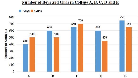 Study the given bar graph and answer the question that follows. What is the ratio of the boys taken together in colleges A, B and C to the girls taken together in all 5 colleges? |