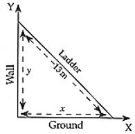 The correct answer is Option (2) → $\frac{5}{6}\,m/sec$ Let the foot of the ladder be at a distance x metres from the wall and y metres be the height of the ladder on the wall at any time t, then $x^2 + y^2 = 169$ …(i) Diff. (i) w.r.t. t, we get $2x\frac{dx}{dt}+2y\frac{dy}{dt}=0$ $⇒\frac{dy}{dt}=-\frac{x}{y}\frac{dx}{dt}$ But $\frac{dx}{dt}= 2\, m/sec$ (given) $⇒\frac{dy}{dt}=-\frac{x}{y}.2=-\frac{2x}{y}$ …(ii) When $x = 5m$, from (i), $y^2 = 169-25 = 144⇒y = 12 m$. Putting $x = 5, y = 12$ in (ii), we get $\frac{dy}{dt}=-\frac{2×5}{12}=-\frac{5}{6}$ Hence, the height of the ladder on the wall is decreasing at the rate of $\frac{5}{6}m/sec$. |