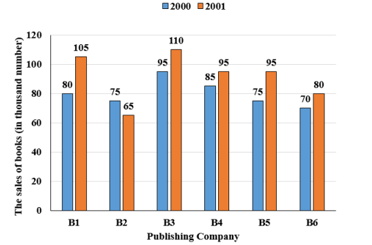 The bar graph given below shows the sales of books (in thousand number) from six branches - B1, B2, B3, B4 , B5 and B6 of a publishing company during two consecutive years 2000 and 2001. Find the percentage (approximate) of the average sales of branches B2, B4 and B6 in the year 2001 to the average sales of branches B1, B3 and B5 in the year 2001. |