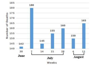 Lets solve one by one for each option . 1. 7 July to 14 July Number of deaths in 7 july week = 180 Number of deaths in 14 july week = 145 Fall in number of deaths = 180 - 145 = 35 2. 28 July to 4 August Number of deaths in 28 july week = 160 Number of deaths in 4 August week = 150 Fall in number of deaths = 160 - 150 = 10 3. 30 June to 7 July Number of deaths in 30 June week = 180 Number of deaths in 7 July week = 142 Fall in number of deaths = 180 - 145 = 38 4. 21 July to 28 July There is increase in number of deaths. So , Highest fall in number of deaths appear in 30 June to 7 July weeks.