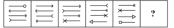 On the 1st diagram in the question cisecle is at the top and arrow with line (- is at the and position. On and diagram this arrow(<-) will came at 1st position arrow (E) will came at and and this arrow(E) will came at and position. This process will rupeat at the last of the diagram Note: Repetation is no allowed i option god will consect Hence the next image will be