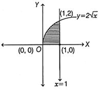 The correct answer is Option (4) → $\frac{4}{3}$ square units We have, $y = 2\sqrt{x} \dots(i)$ $x = 0 \dots(ii)$ and $x = 1 \dots(iii)$ On solving Eqs. (i), (ii) and (iii), we get $x = 0 \Rightarrow y = 0$ and $x = 1 \Rightarrow y = 2$ $∴$ Intersecting points are $(0, 0)$ and $(1, 2)$. $∴$ Area of shaded region $= \int\limits_{0}^{1} (2\sqrt{x}) \, dx$ $= 2 \cdot \left[ \frac{x^{3/2}}{3}\cdot 2 \right]_{0}^{1}$ $= 2 \left( \frac{2}{3} \cdot 1 - 0 \right) = \frac{4}{3} \text{ sq. units}$ |