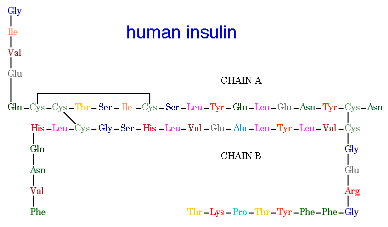 Function of Insulin Insulin regulates blood glucose levels by promoting the uptake of glucose into liver, muscle, and fat cells, where it is used for energy or stored as glycogen. Here’s a detailed look at its functions: 1. Glucose Uptake: Insulin facilitates the entry of glucose into cells by increasing the number of glucose transporters on the cell membrane. 2. Glycogen Synthesis: In the liver and muscle cells, insulin promotes the conversion of glucose to glycogen for storage. 3. Fat Storage: Insulin enhances the storage of fat in adipose tissue by promoting the synthesis of fatty acids and inhibiting the breakdown of fat. 4. Protein Synthesis: Insulin stimulates the uptake of amino acids into cells, promoting protein synthesis and inhibiting protein degradation. Synthesis and Release of Insulin 1. Synthesis: Insulin is initially synthesized as a single polypeptide called preproinsulin. This precursor undergoes cleavage to form proinsulin, which further undergoes processing to generate the mature insulin molecule and C-peptide. 2. Release: Insulin is stored in secretory granules in the beta cells and released into the bloodstream in response to elevated blood glucose levels. Clinical Significance Diabetes Mellitus: A condition characterized by insufficient insulin production (Type 1 Diabetes) or insulin resistance (Type 2 Diabetes), leading to elevated blood glucose levels. Insulin Therapy: Used to manage diabetes by providing exogenous insulin to mimic the normal physiological insulin response. Insulin is a hormone composed of 51 amino acids in total, arranged into two chains: the A chain with 21 amino acids and the B chain with 30 amino acids. These chains are connected by disulfide bonds, crucial for the hormone's stability and function. Insulin plays a vital role in regulating glucose metabolism, promoting glucose uptake, and ensuring proper energy storage and utilization in the body. |