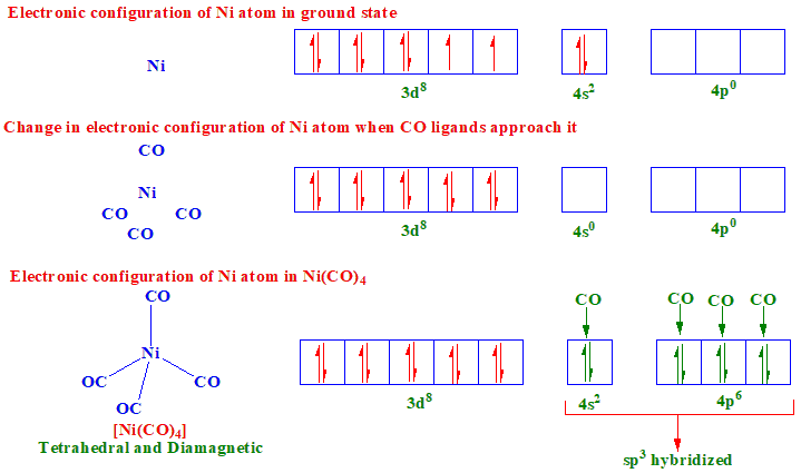 The correct answer is option 3. Tetrahedral, Diamagnetic. The valence shell electronic configuration of ground state \(Ni\) atom is \(3d^8 4s^2\). All of these 10 electrons are pushed into \(3d\) orbitals and get paired up when strong field \(CO\) ligands approach \(Ni\) atom. The empty \(4s\) and three \(4p\) orbitals undergo \(sp^3\) hybridization and form bonds with \(CO\) ligands to give \(Ni(CO)_4\). Thus \(Ni(CO)_4\) is diamagnetic.