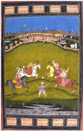 Observe the image and read the passage given below and answer the following question. Here, they are playing an equestrian game Chaugan, a popular royal sport of the time. The painting appears to be provincial of much later period, and is in the collection of the National Museum, New Delhi, India. |