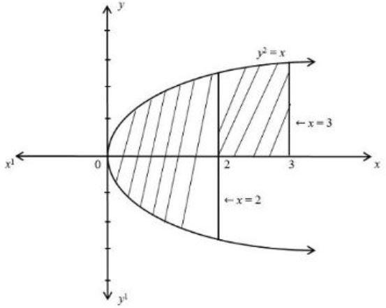 The correct answer is Option (2) → $\frac{4\sqrt{2}}{3}+2\sqrt{3}$ Shaded region = area inside parabola $y^2=x$ from $x=0$ to $x=2$ (both above and below $x$-axis) plus area under upper branch from $x=2$ to $x=3$. Area$_1$ (for $0\le x\le2$): $ \displaystyle \int_{0}^{2} \big(\sqrt{x}-(-\sqrt{x})\big)\,dx = 2\int_{0}^{2} x^{1/2}\,dx = 2\left[\frac{2}{3}x^{3/2}\right]_0^2 = \frac{4}{3}\cdot 2^{3/2} = \frac{8\sqrt{2}}{3}$. Area$_2$ (for $2\le x\le3$, above $x$-axis): $ \displaystyle \int_{2}^{3} \sqrt{x}\,dx = \left[\frac{2}{3}x^{3/2}\right]_2^3 = \frac{2}{3}\big(3^{3/2}-2^{3/2}\big) = \frac{2}{3}\big(3\sqrt{3}-2\sqrt{2}\big)$. Total area $=$ Area$_1$ + Area$_2$ $\displaystyle = \frac{8\sqrt{2}}{3} + \frac{2}{3}\big(3\sqrt{3}-2\sqrt{2}\big) = \frac{2}{3}\big(2\sqrt{2}+3\sqrt{3}\big) = \frac{4\sqrt{2}+6\sqrt{3}}{3}$. Required area = $\displaystyle \frac{4\sqrt{2}+6\sqrt{3}}{3}$ |