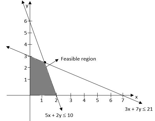 The maximum value of $Z=3x+4y $ subjected to the constraints $3x+7y ≤21, 5x+2y ≤10; x, y ≥ 0$ is : |