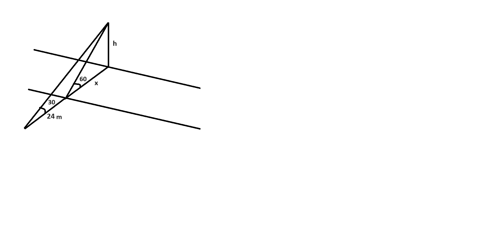 h/x = tan 60 h = x tan 60 Also, h/(x+24) = tan 30 x tan60/(x+24) = 1/√3 x √3 / (x+24) = 1/√3 x+24 = 3x 2x = 24 x = 12 The correct answer is Option (1) → 12 |