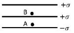 0 at A and 0 at B $\frac{σ}{2ε_0}$ at A and $\frac{3σ}{2ε_0}$ at B $\frac{3σ}{2ε_0}$ at A and $\frac{σ}{2ε_0}$ at B $\frac{3σ}{2ε_0}$ at A and 0 at B |