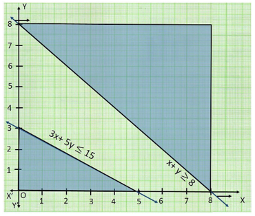 The correct answer is Option (2) - no feasible solutions $Z=3 x+2 y$ $x+y \geq 8$ $3 x+5 y \leq 15$ $x, y \geq 0$ No feasible region exists |