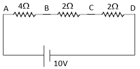 The correct answer is Option (4) → 7.5 V Now, Voltage across AD = 10 V $R_{eq}=4+2+2=8Ω$ [Connected in series] $∴I=\frac{V}{R}=\frac{10}{8}$ [By ohm's law] $V_{AC}=V_{AB}+V_{BC}$ $=4×\frac{10}{8}+2×\frac{10}{8}$ $=7.5V$ |