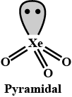 \(XeO_3\) is isostructural with \(BrO_3^−\). It has a pyramidal shape due to \(sp^3\) hybridization with tetrahedral geometry in which one position is occupied by a lone pair.